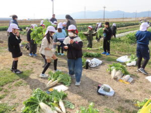 今年度も地域の「夢ファームターチャン」にご協力いただきながら、育ててきた大根が立派に育ち、昨日3年生全員で大根畑に収穫に行ってきました。