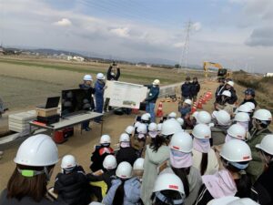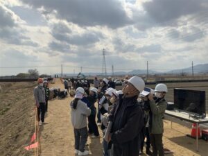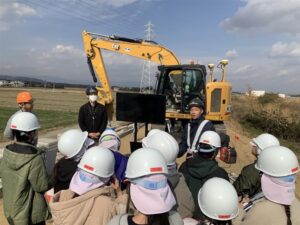 今回の見学は、校区内にある河川の堤防工事を三重県松阪建設事務所様に多大なるご協力をいただき、実現できました。